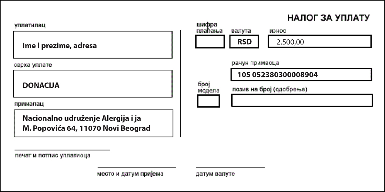 Uplatom godišnje članarine na račun 105 052380300008904 u iznosu od 2.500 RSD postajete član Kluba Alergija i ja. Nakon uplate, jednostavno nam pošaljite mejl sa svojim podacima na prijava@alergijaija.com.