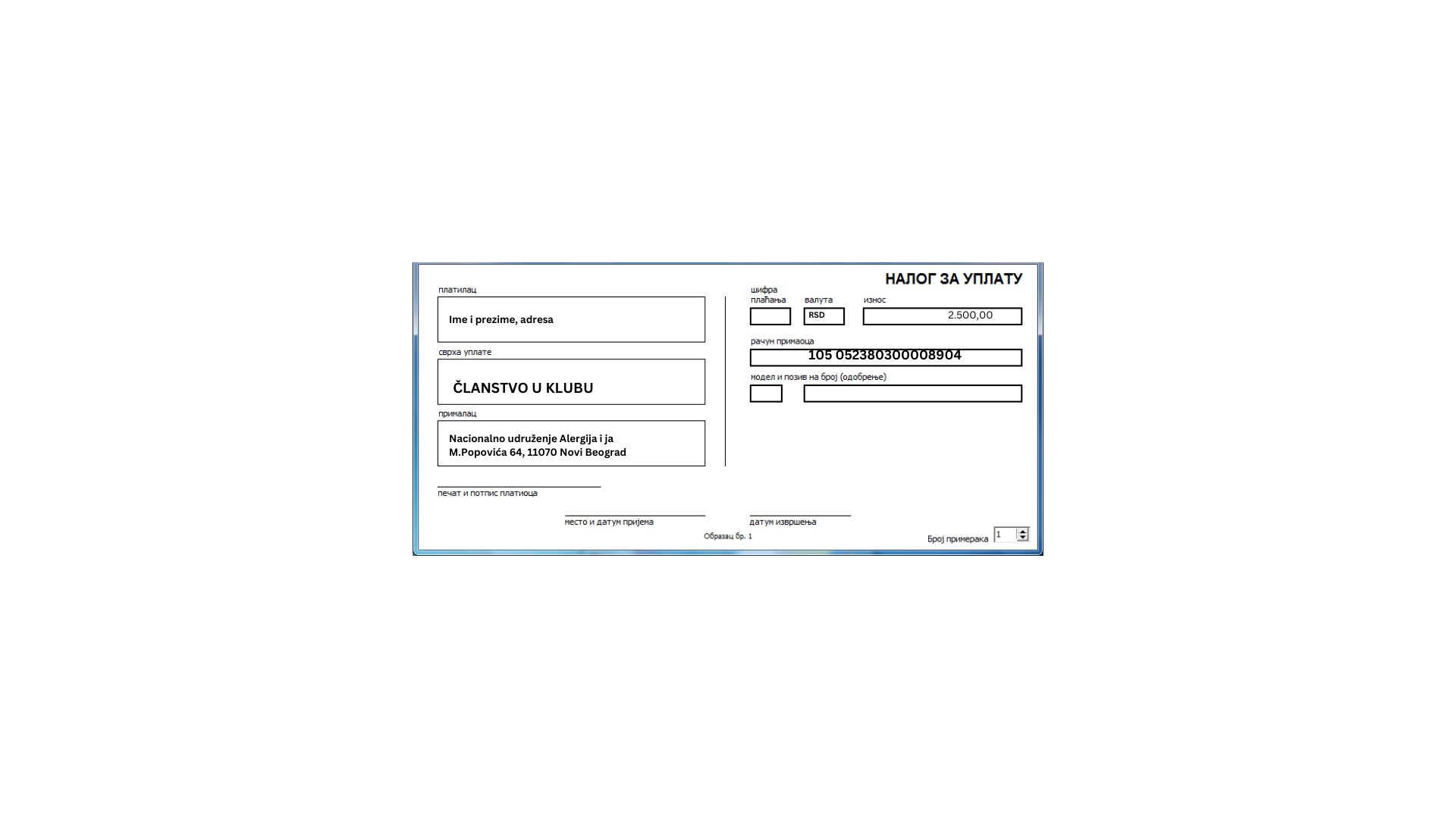Uplatom godišnje članarine na račun 105 052380300008904 u iznosu od 2.500 RSD postajete član Kluba Alergija i ja. Nakon uplate, jednostavno nam pošaljite mejl sa svojim podacima na prijava@alergijaija.com.